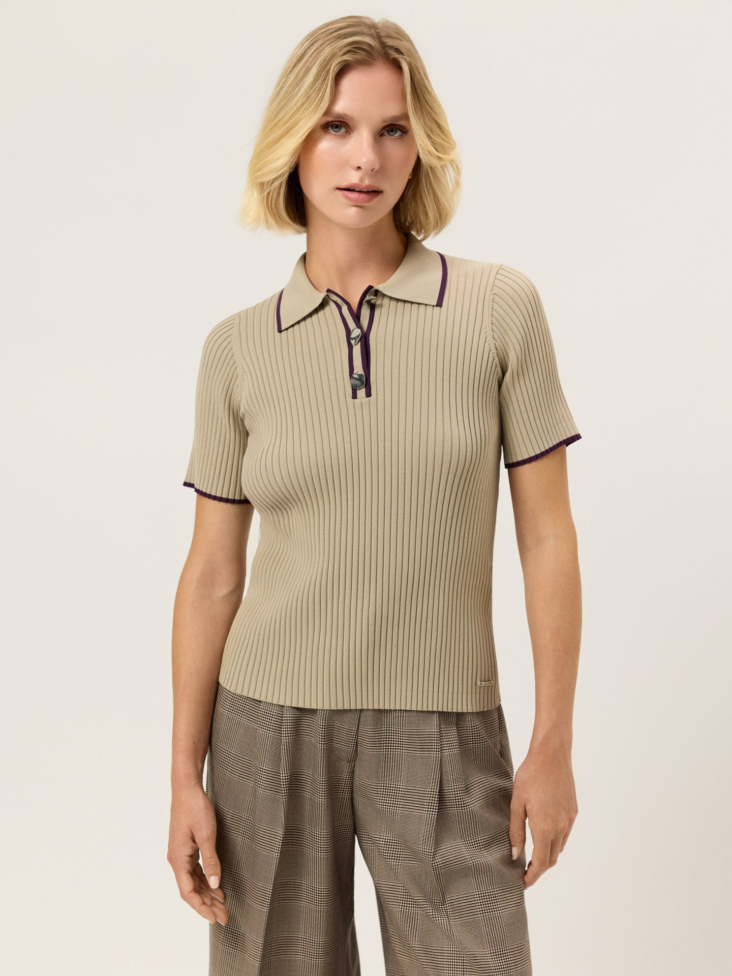 Short-sleeve polo sweater made from viscose blend, featuring an all-over rib knit design. It has a front placket with organic gold buttons, a ribbed knit collar, and constrast color stripe on the collar, placket and sleeves. Fully fashioned at the shoulder seams and armholes.