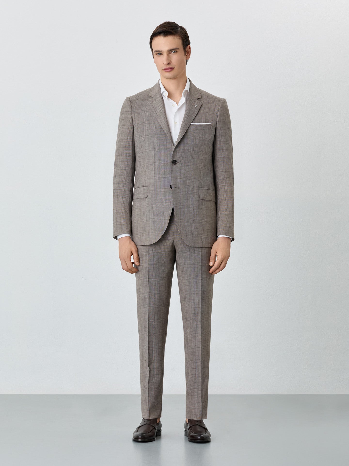 K-Moving prince of Wales suit from Prestige and K-Easy line expertly tailored from Super Fine Wool. Suit made with Loro Piana italian fabric, the Moving series from Loro Piana are luxurious stretch fabrics that are great for busy days on the move, and offers superior comfort and mobility. This Special Edition slim fit formal two-piece suit has flawless details and full lining. Two-button blazer with notch lapels and welt pockets with flap, four-button cuffed, two back slits, front and special interior pockets with zip. Trousers with zip fly, button and hook extended waistband fastening, two side pockets with coin pocket, two back welt pockets and belt loops. All suits have regular fitting measures from sizes 56 to 62. Transform a timeless suit into a bold, contemporary statement. K-easy line is a selection of garments made of technical fibers for limitless performance, and most of all, without losing its signature sharp look, whatever you do, wherever you go. This selection includes a wide range of advanced features as bi-stretch, quick-dry, easy-iron, thermoregulator, breathable or water-repellent fabrics.