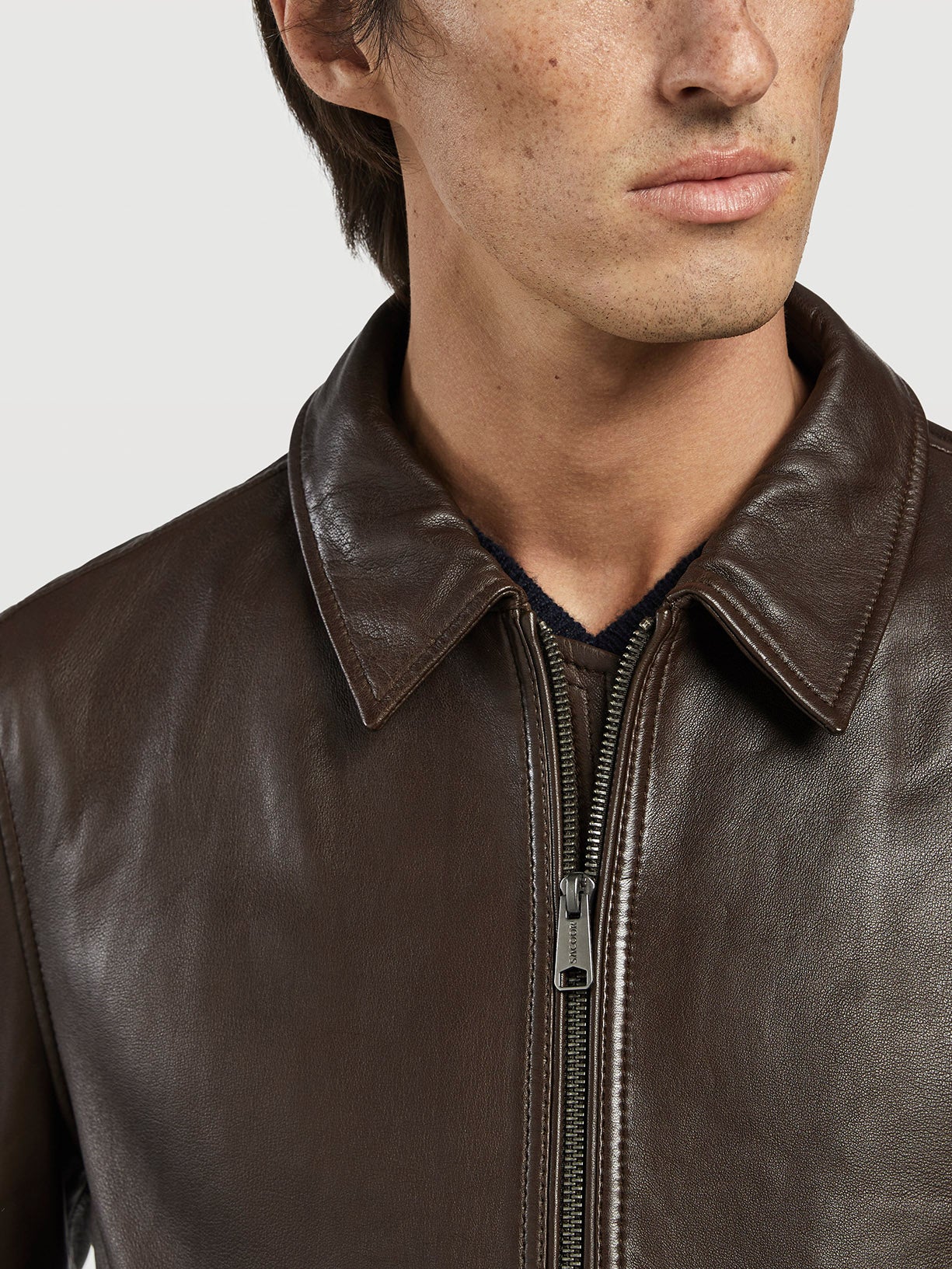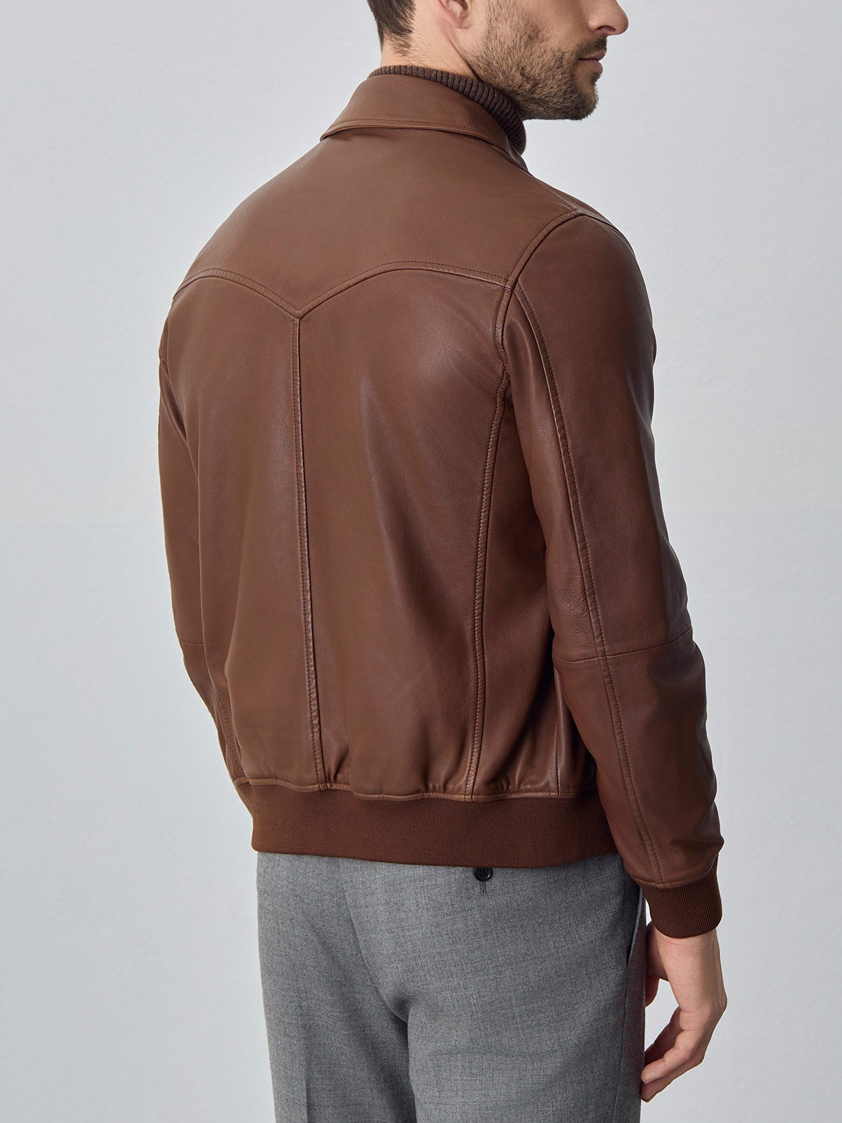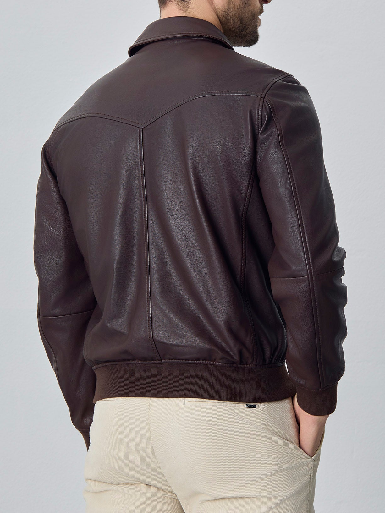 Zipped bomber jacket in genuine leather with pointy collar and ribbed cuffs and bottom. Featuring front and interior pockets. Fully lined.