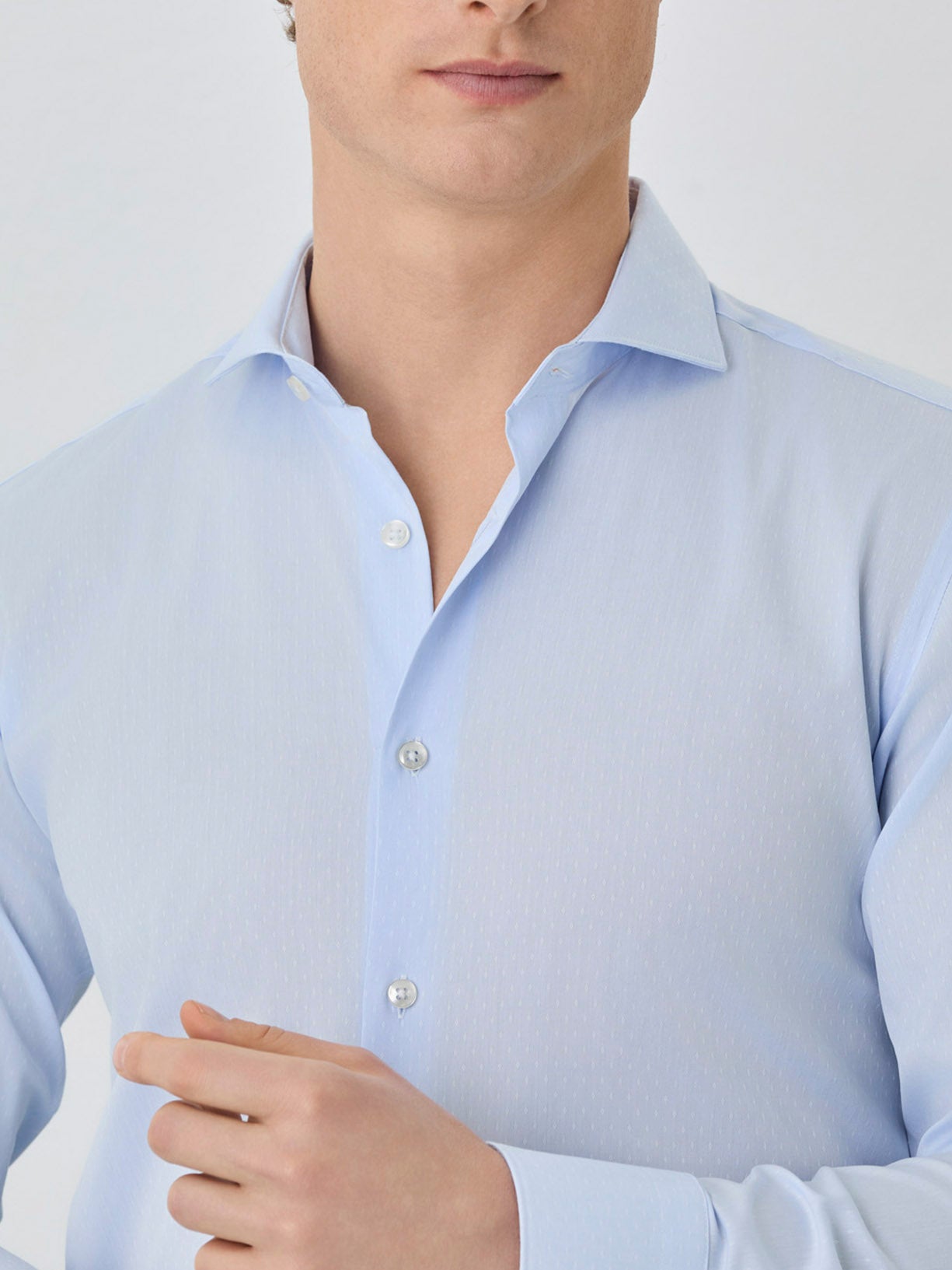 Business line shirt in plain structure. Fabric made of 100% cotton. Featuring slim fit, Dublin collar and front button-up fastening. Long sleeves with single cuffs with 2 buttons. Side gussets in self fabric. All shirts have regular fitting measures from size 44. Thanks to impeccable workmanship, the finest materials, taste, and passion, our business shirt is perfect for any formal occasion, where the most important thing is to look clean-cut, elegant, and understated.