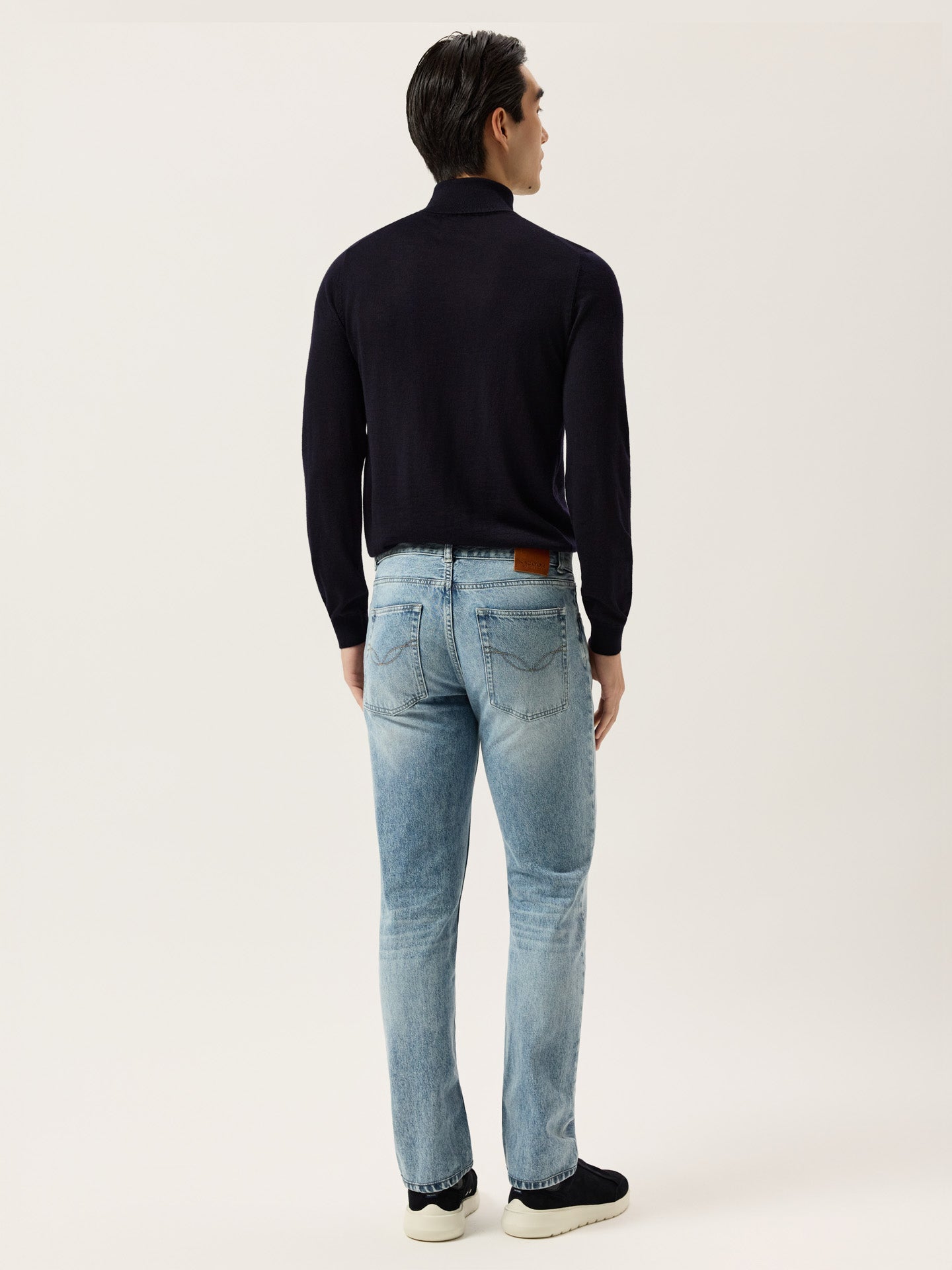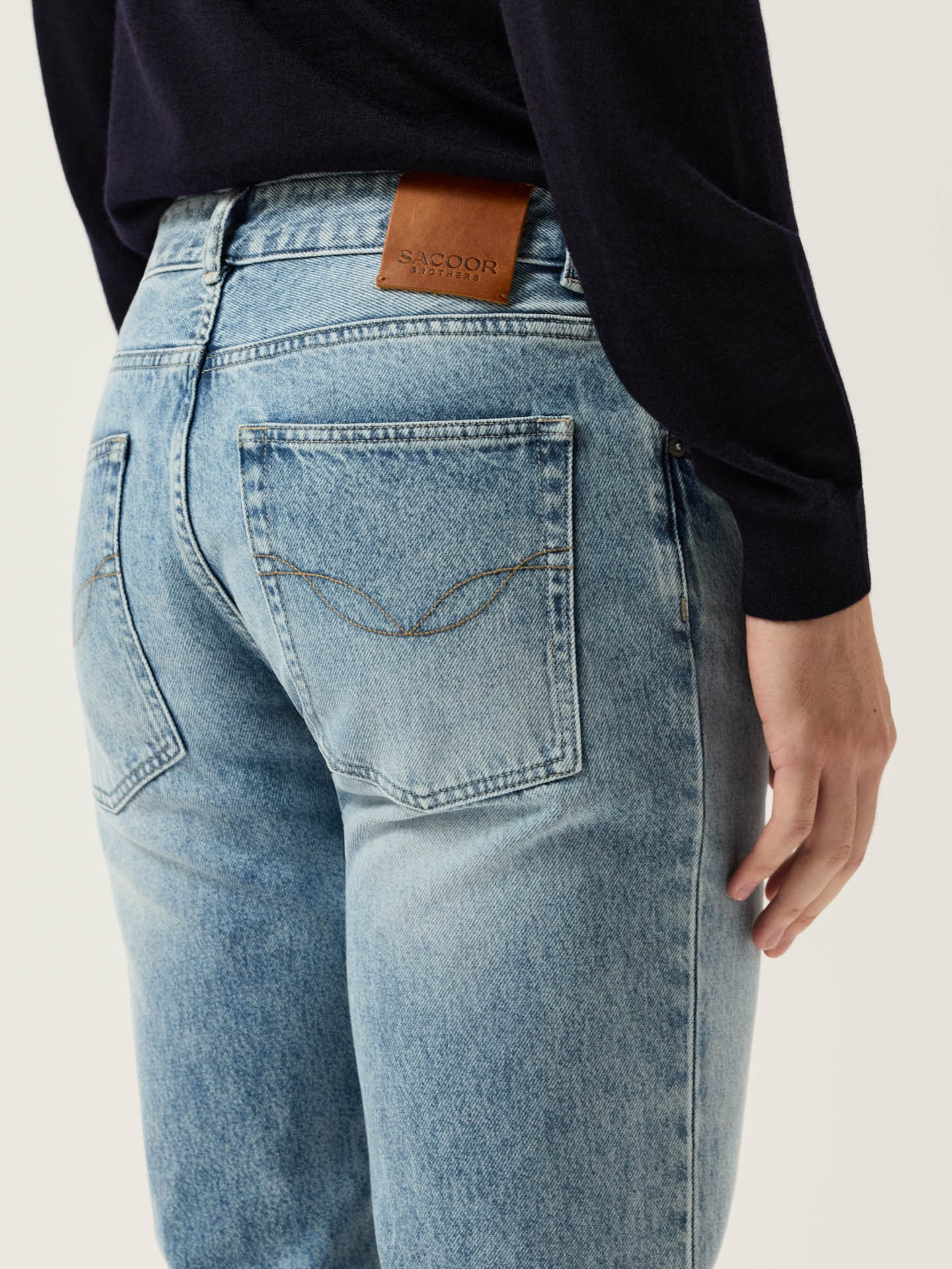 Denim Trousers in Boston Fit. Featuring a slim leg and low waist, these trousers are crafted from premium cotton denim with contrasting beige stitching. They are finished with a branded leather label at the back and metal buttons at the fly.