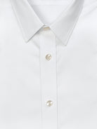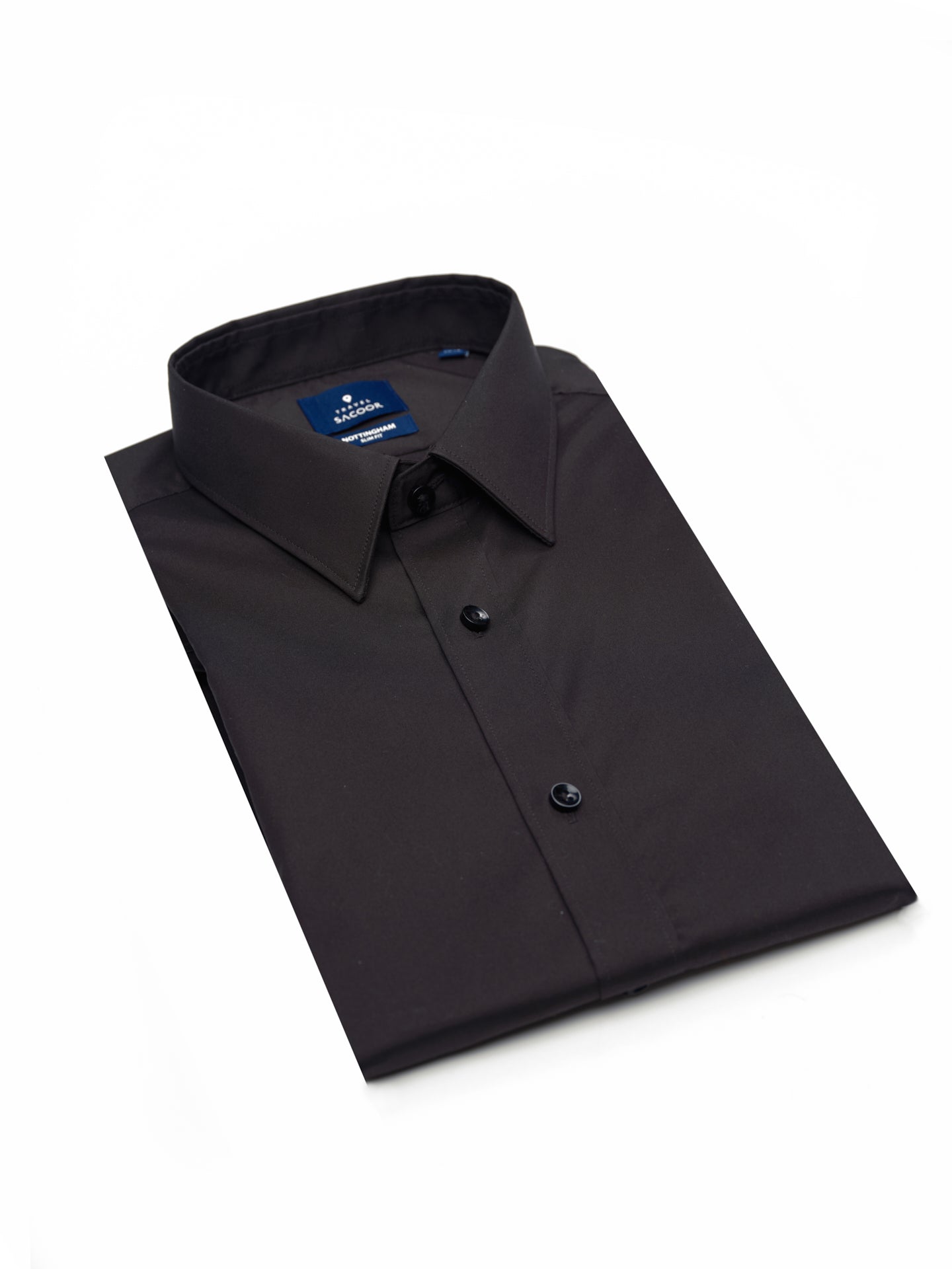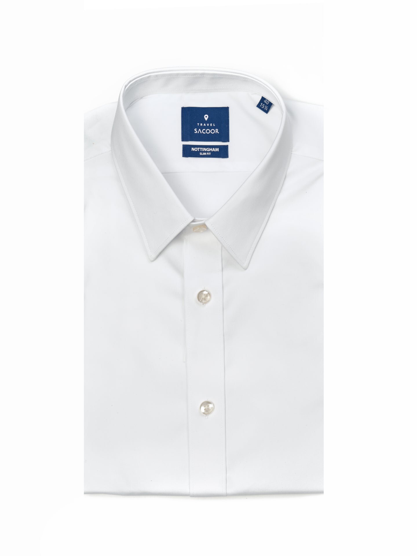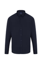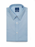 K-Easy line shirt in travel quality 120's plain poplin made of blended cotton, polyester and spandex. Featuring a Nottingham collar and front fastening through seven buttons. Long sleeves with single cuffs with 1 button. All shirts have regular fitting measures from size 44.