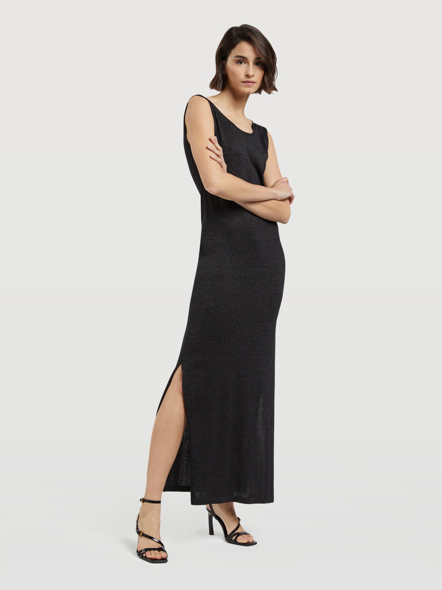 Long knit dress with side slits, above the knee. Featuring boat neckline and oval back detail. Brand metal plate at the back.