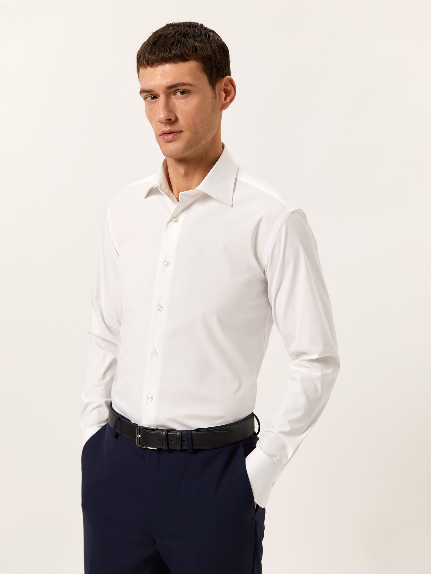 A refined piece that offers lasting elegance and easy versatility. Made from a comfort cotton poplin blend with polyester and spandex, this Travel line shirt ensures perfect comfort, an excellent fit, and top-performance yarns for elasticity, breathability, and a subtle shine. Designed in a slim fit, it features an Oxford collar, front button-up fastening, long sleeves with single cuffs and two buttons, a chest pocket, and side gussets in the same fabric. Available in regular Fit sizes starting from size 44. This shirt is perfect for office wear and any occasion where a sharp look matters. Shirts for every occasion — once you try it, you won’t want to wear anything else.