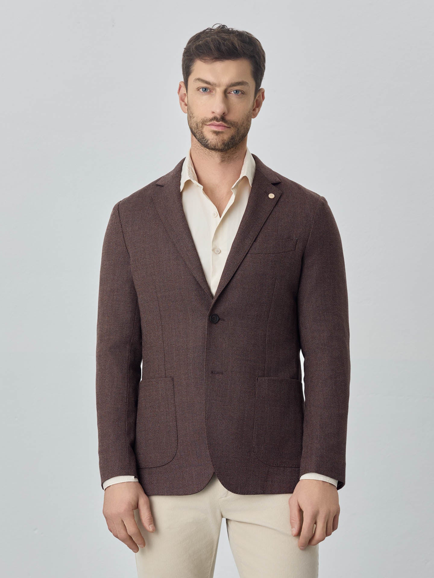 Luxeleisure edition herringbone bi-stretch blazer, perfectly balances comfort and a pulled-together appearance. It's made from stretch blend that feels soft to the touch and has a refined profile. Style with notch lapels, two-button closure, patch pockets and two back vents. Sleeves with four-button cuffs. It's no lined for comfort and a more casual fit. All blazers have regular fitting measures from sizes 56 to 62. This blazer permits unrestricted movement, for absolute comfort all day long. Luxeleisure line explores the space between refinement and relaxation, comfort and effortless style, functionality and elegance.