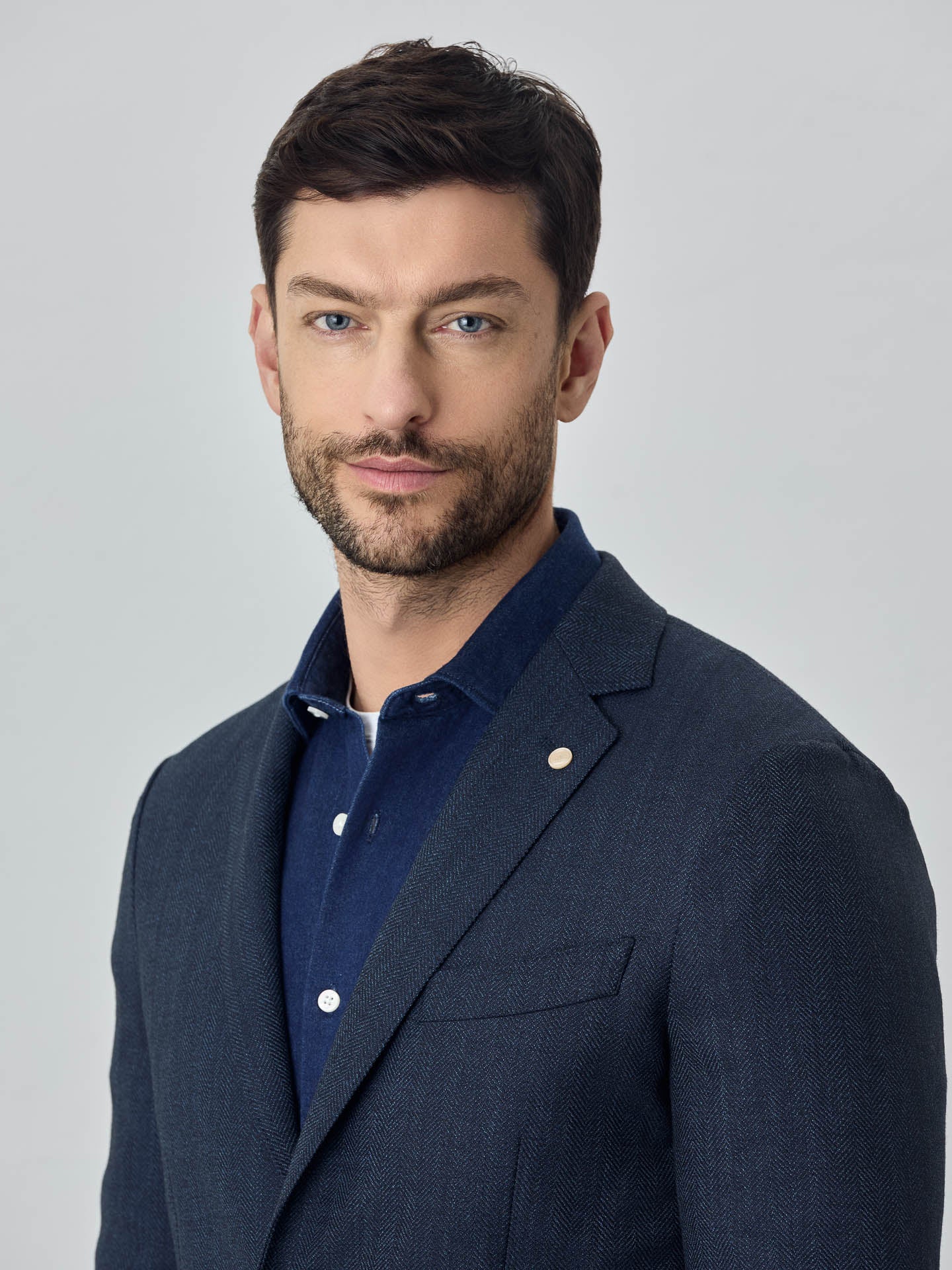 Luxeleisure edition herringbone bi-stretch blazer, perfectly balances comfort and a pulled-together appearance. It's made from stretch blend that feels soft to the touch and has a refined profile. Style with notch lapels, two-button closure, patch pockets and two back vents. Sleeves with four-button cuffs. It's no lined for comfort and a more casual fit. All blazers have regular fitting measures from sizes 56 to 62. This blazer permits unrestricted movement, for absolute comfort all day long. Luxeleisure line explores the space between refinement and relaxation, comfort and effortless style, functionality and elegance.