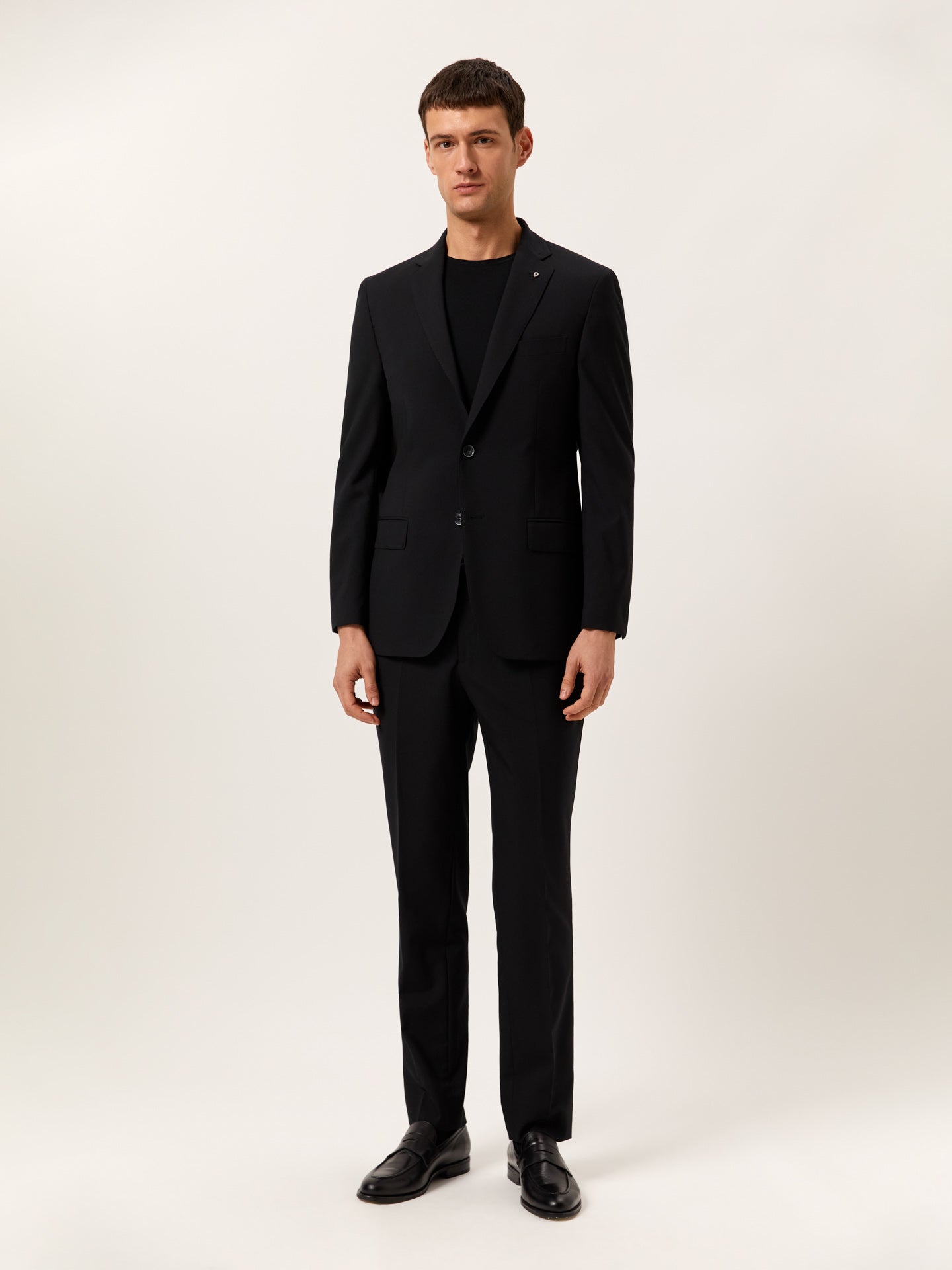 A refined piece that offers lasting elegance and easy versatility. Expertly tailored from high-performance Wool with added elastane, it ensures excellent comfort, a perfect fit, and top-level performance. The premium yarns provide superior elasticity, breathability, and crease resistance. This slim-fit two-piece suit creates a relaxed silhouette that suits a wide range of body types. The two-button blazer features notch lapels, flap pockets, four-button cuffs, two back vents, special zipped inner pockets, and an interior pocket with EMW protection. The trousers include a zip fly with button and extended waistband fastening, two side pockets with a coin pocket, two back welt pockets, and belt loops. Available in regular Fit measurements from size 56 to 62. Ideal for the office and any situation where a sharp look matters. Suits for every occasion — once you try one, you won’t want to wear anything else.