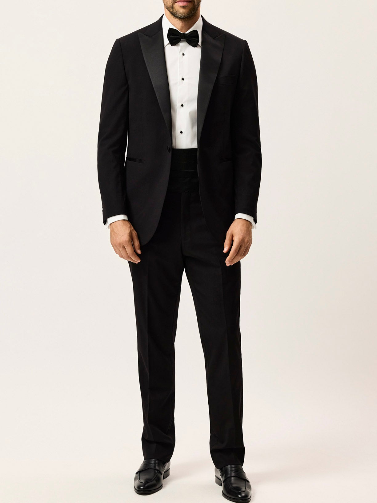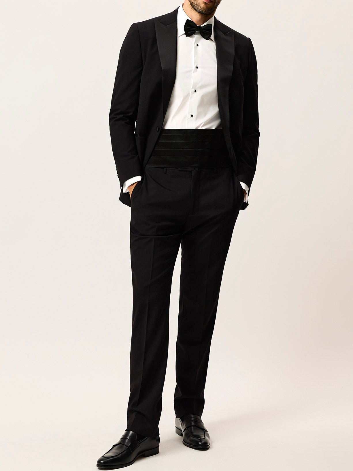 Party line ICON tuxedo suit expertly tailored from blend wool and spandex. Features a coat with satin peak lapels. One-fabric button fastening and four-button detail on the sleeves, two side welt pockets, a chest pocket, three interior pockets and two openings on the back. Trousers with zip and invisible button fastening. Features waist with belt loops. Satin side detail. This tuxedo is a party piece that will earn you sartorial points season-after-season.