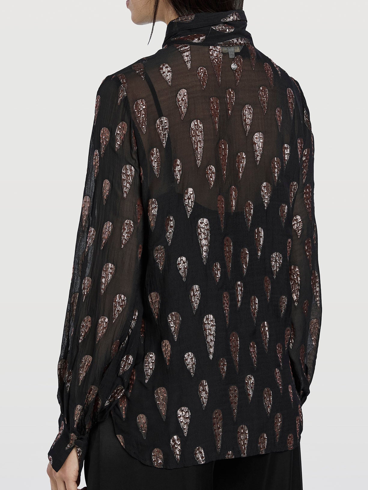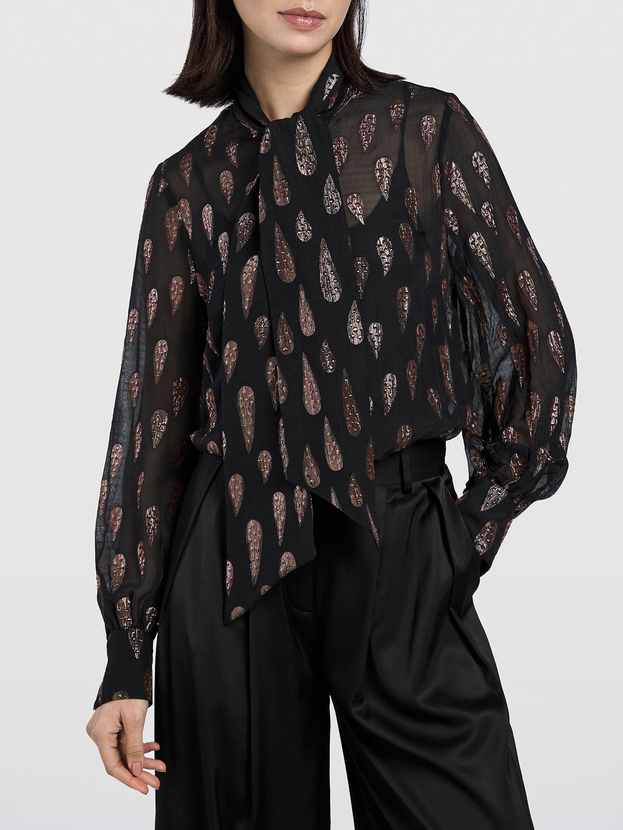 Blouse with folded collar with a big tie on the neck closure, long sleeves with frill bottom and one-button cuffs. Features a fancy jacquard fabric perfect for special occasions.