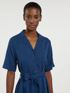 Long dress made from rayon linen quality. Features a notch lapel collar, side pockets and two front pockets on the chest, short sleeves with folded hem, side splits and self-fabric belt.