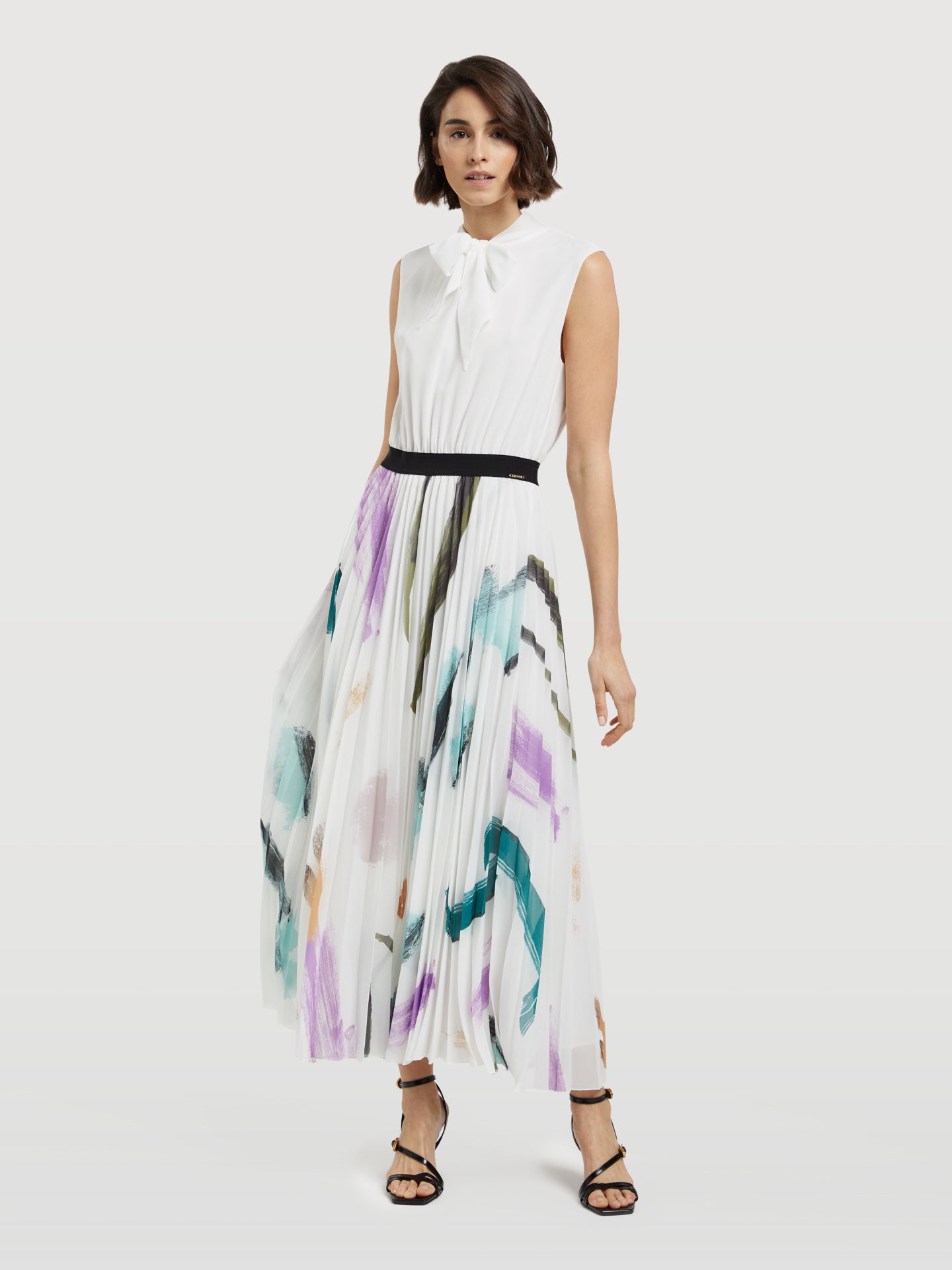 Long dress made from 100% polyester. Features elegant top with midi length skirt with soleil pleating and a side invisible zipper fastening. Brand metal plate at the front.