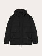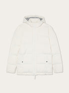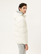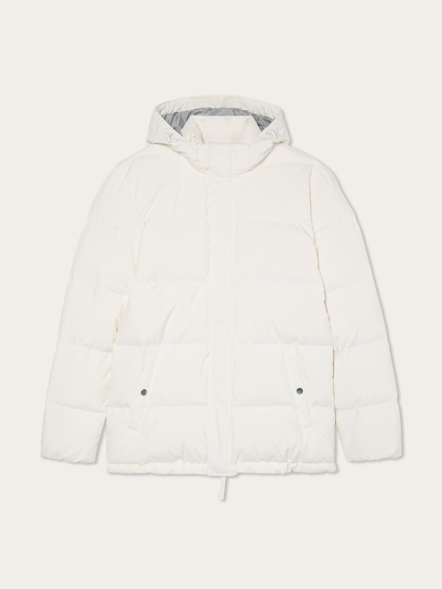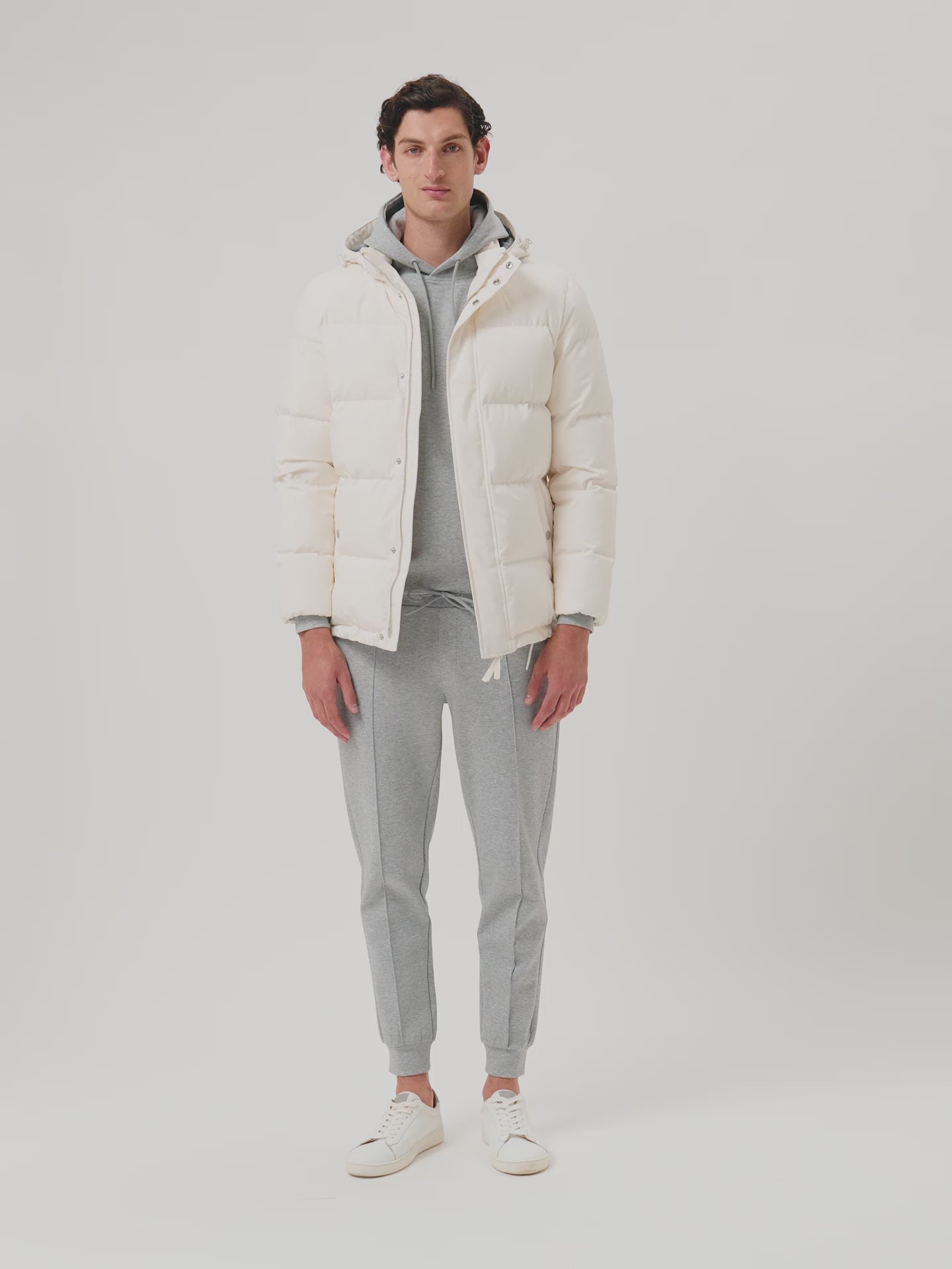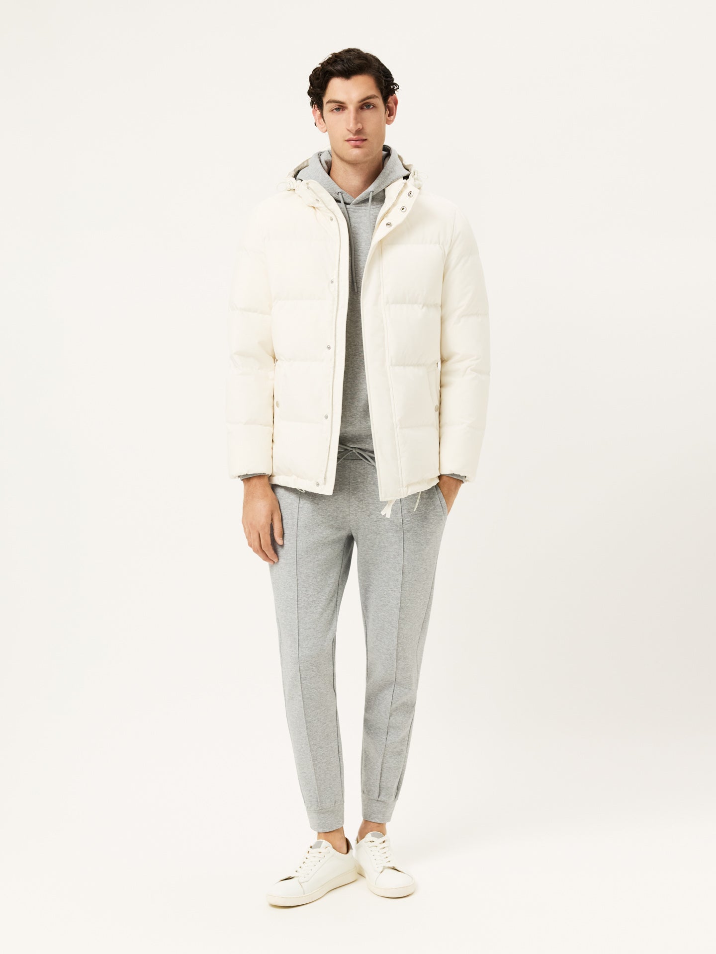 Winter puffer jacket in lightweight filmed polyester, padded with real down for superior insulation. Features a detachable hood, hidden zip and snap button closure, and slanted front pockets with metal snaps. Elastic cuffs and tonal accessories ensure comfort and a clean finish. Fully lined with contrast shell fabric and subtle flat piping inside.