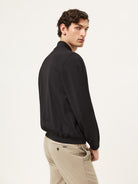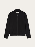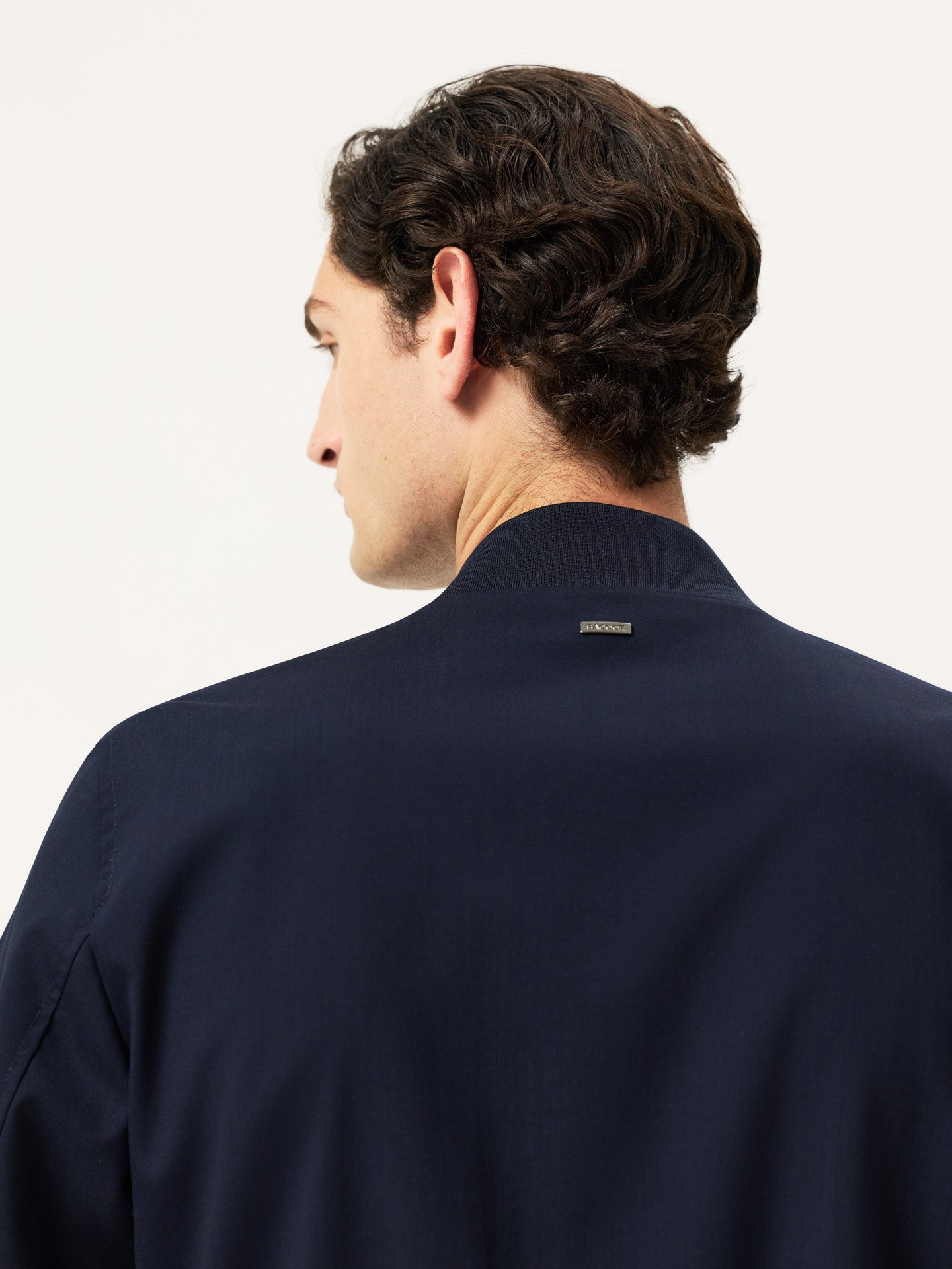 A modern classic for winter, this bomber jacket is tailored in a premium wool blend with natural stretch and a soft hand feel. It features a ribbed collar, cuffs and hem in tonal nylon knit for added structure and comfort. The clean front is designed with a shiny gunmetal zipper and personalized pullers, while discreet slanted side pockets blend seamlessly into the silhouette. Inside, the jacket is fully lined with custom Sacoor jacquard and finished with contrast piping and zippered pocket. A laser-engraved metal logo plate at the back collar signs this elevated essential.