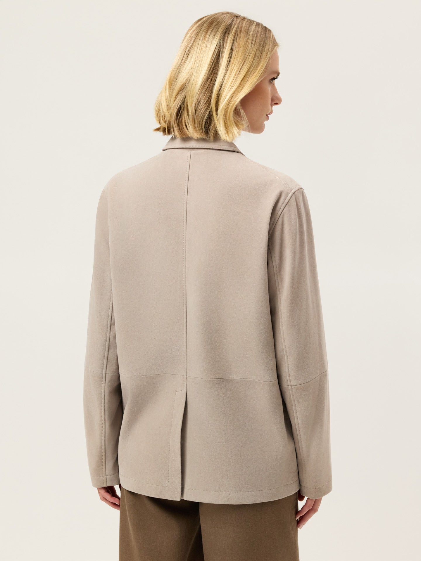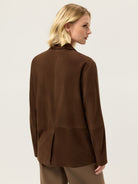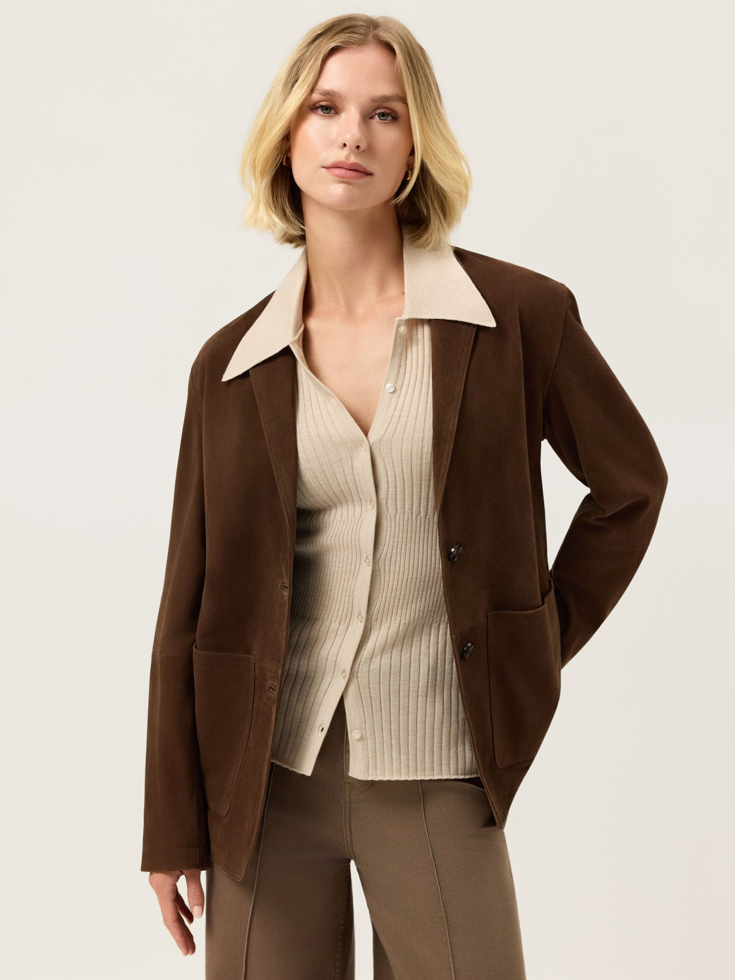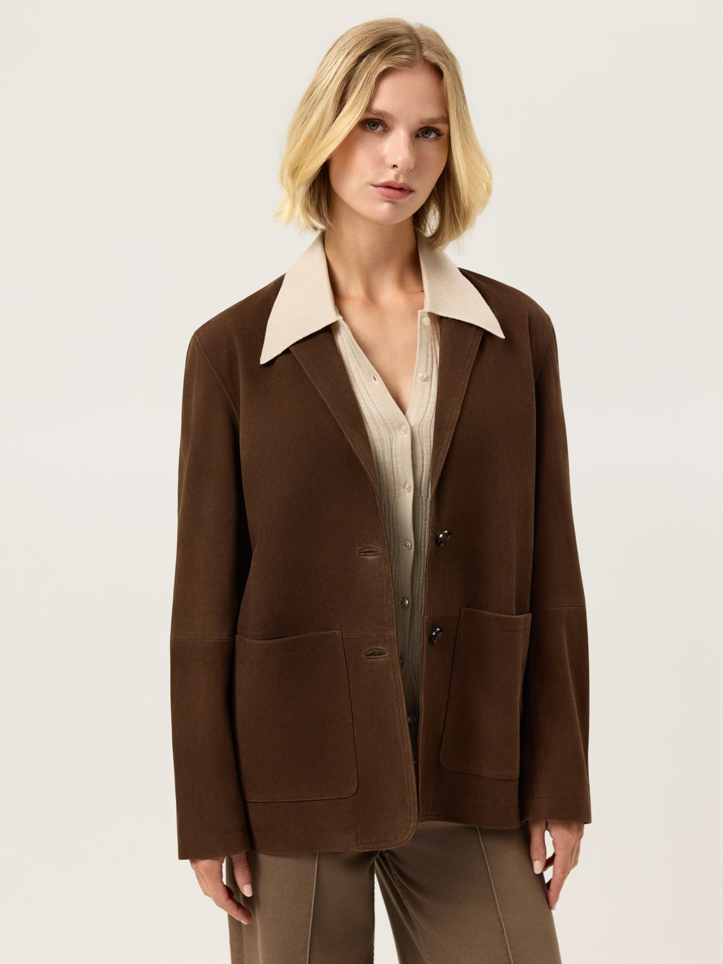 Suede Blazer designed with an oversize fit. Features patch pockets at front and two buttons, notch lapel, fully lined interior and one slit on the back.
