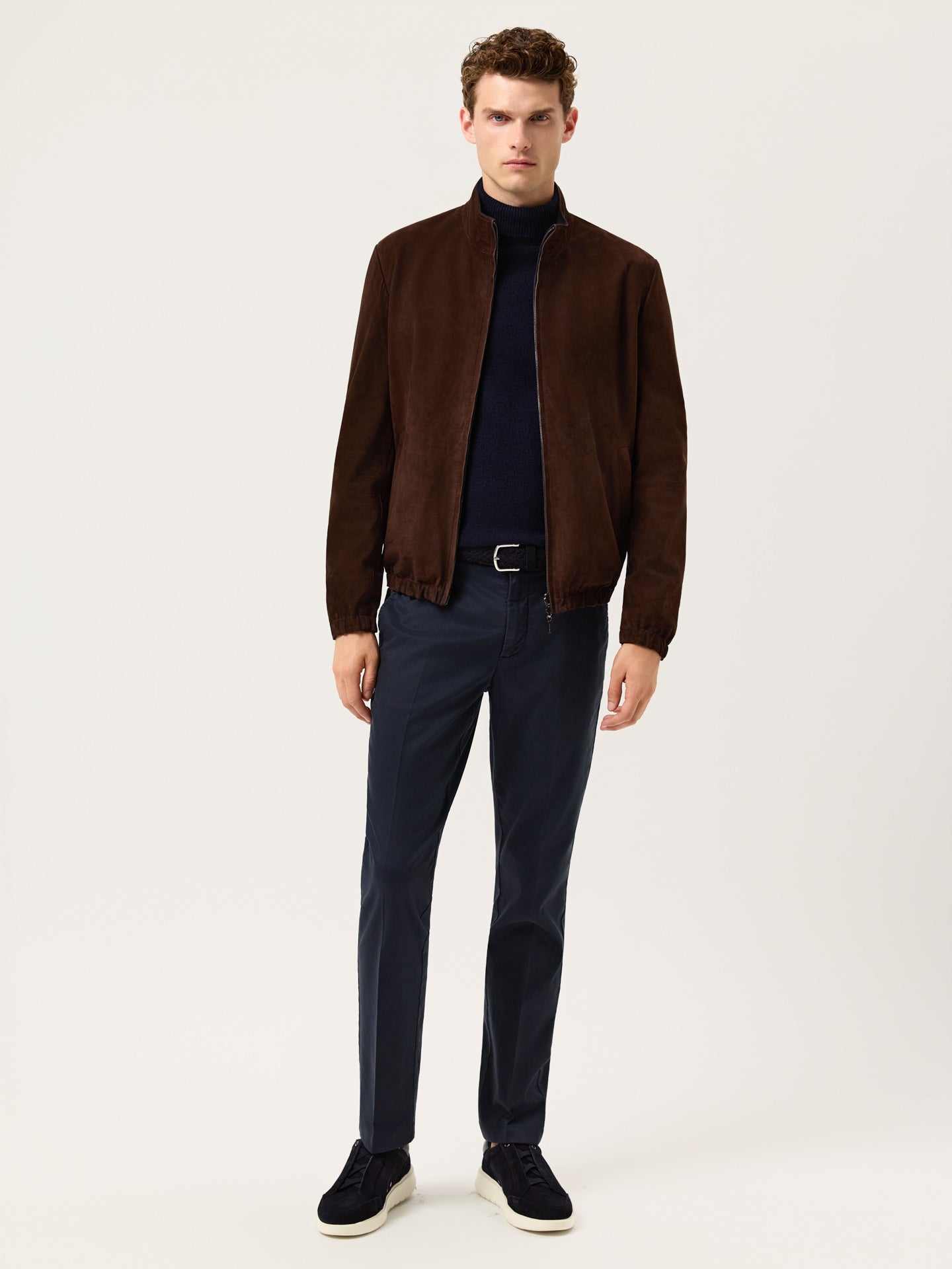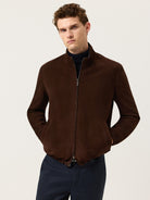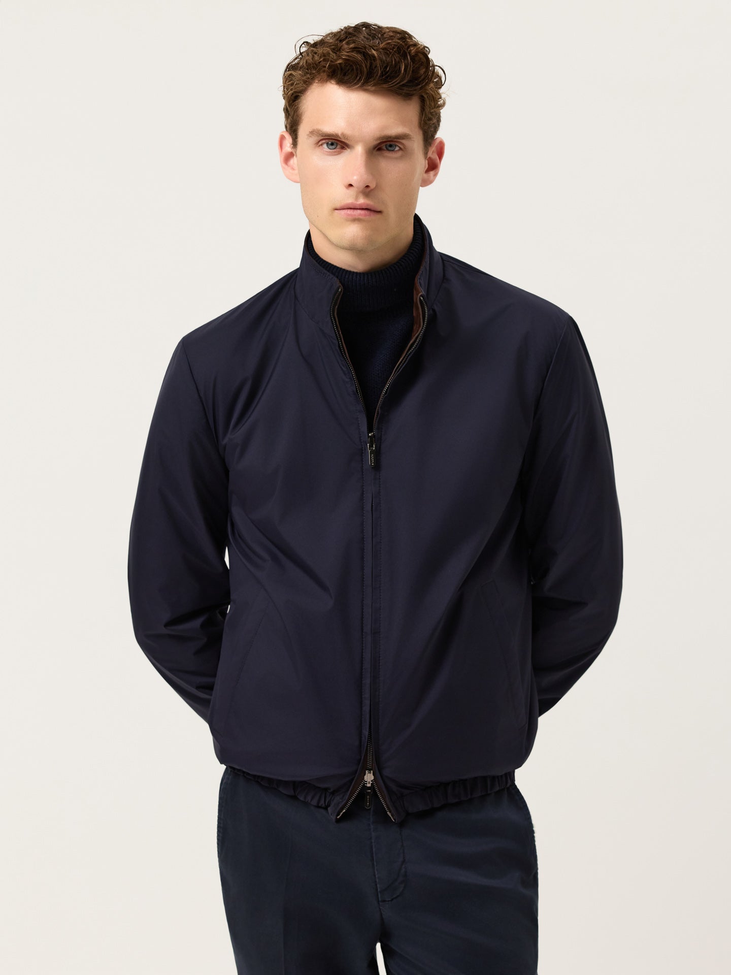 Modern bomber-style jacket crafted from premium cow calf nubuck leather, fully reversible with a contrast dark blue nylon interior. Designed with a high collar, anatomic cut, and elasticated cuffs and hem for a comfortable, structured fit. The leather side features piped zip pockets, a front zipper closure with reversible puller, and clean finishing with hidden edge painting. The interior side, in lightweight nylon, includes piped pockets without zippers for a more casual, functional look. Finished with gunmetal hardware and tone-on-tone stitching for a sleek, minimalist appearance.
