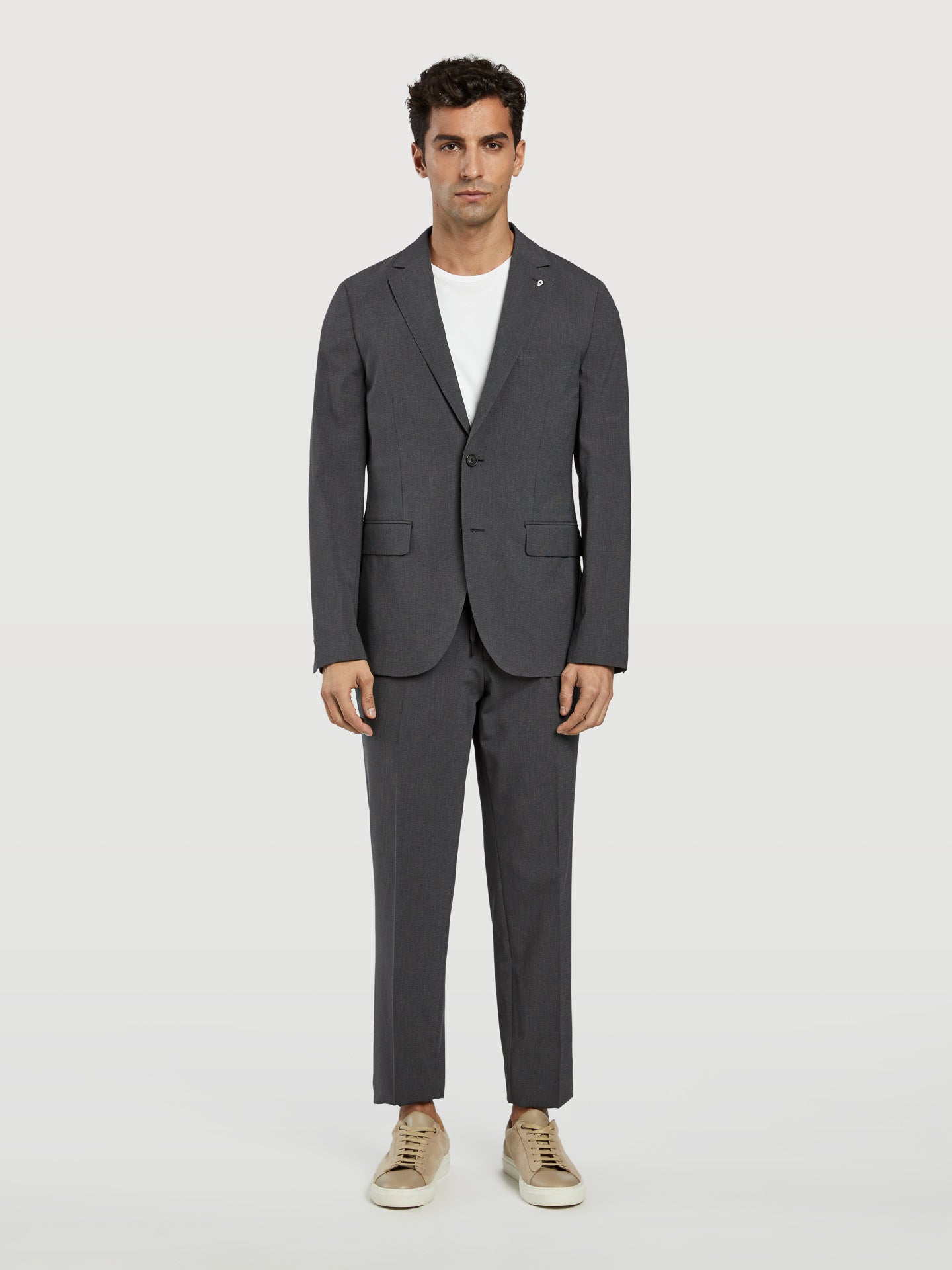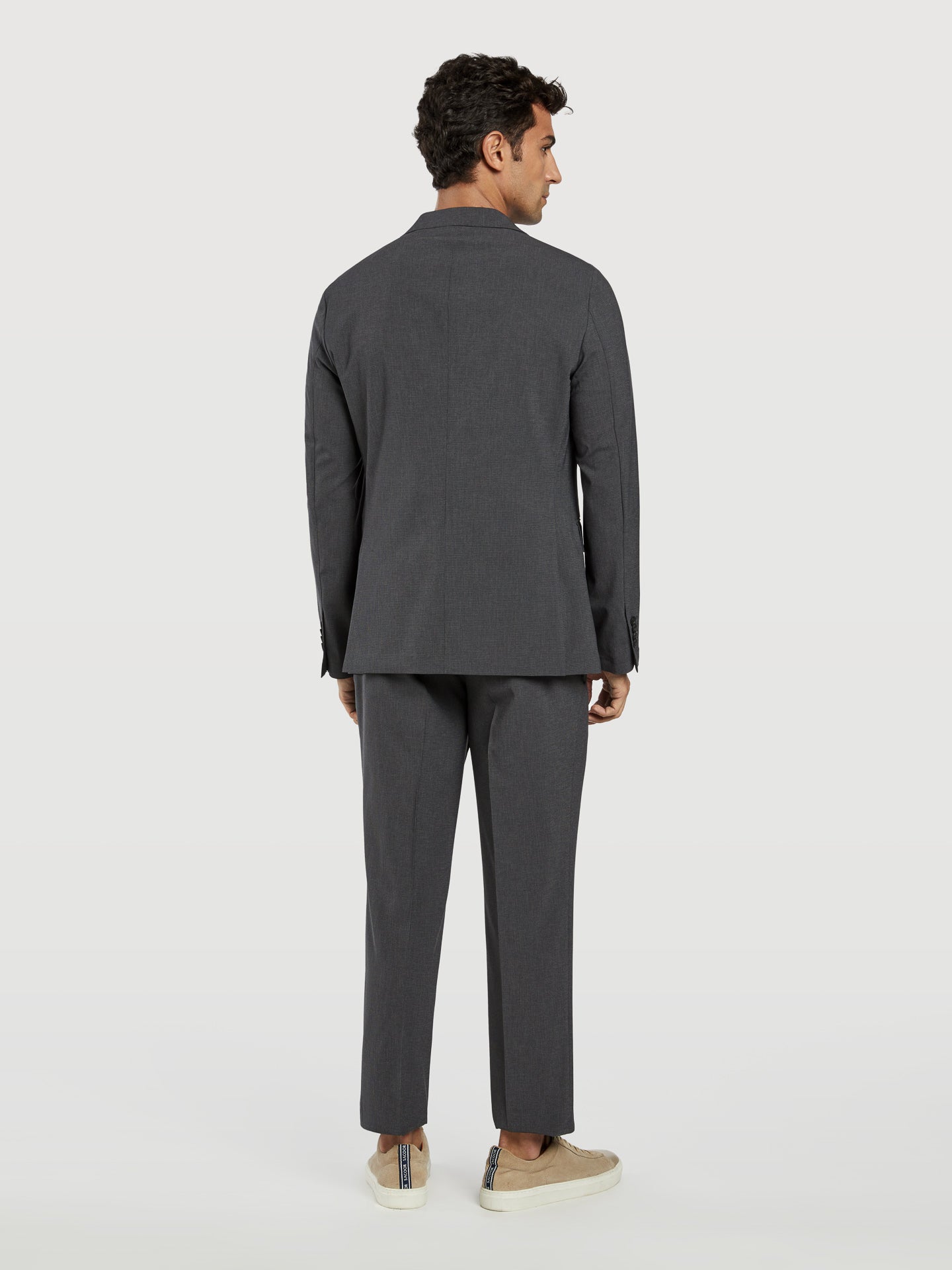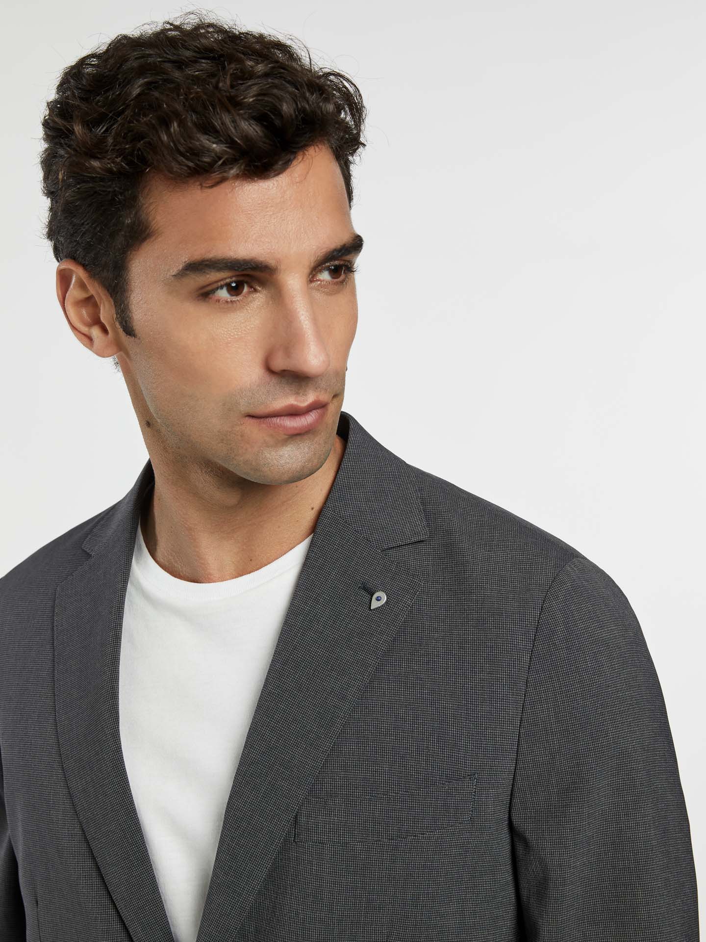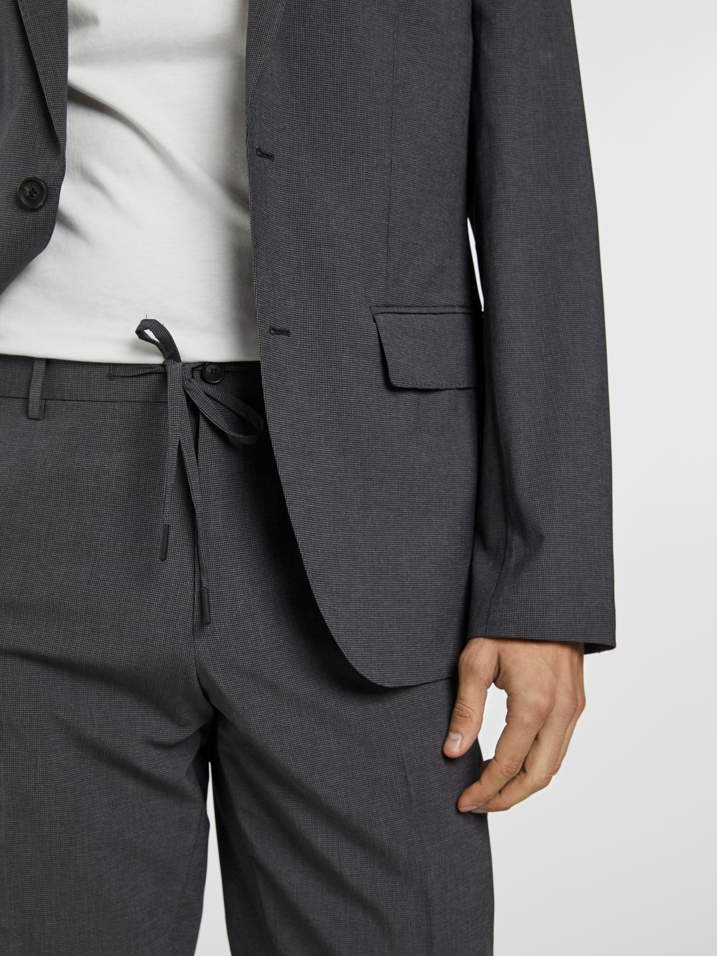 Puppytooth respeckt suit from 100% recycle polyester. This slim fit two-piece suit creates a relaxed silhouette that is ideal for all profiles. Two-button blazer with notch lapels and welt pockets with flap, four-button cuffed, two back slits, It's fully unlined for more comfort and have special techical inside details like zip pockets and mesh pocketings. Special comfort trousers with zip fly and button, waistband with elastic at back and drawstring in self fabric, two side pockets with coin pocket, two back welt pockets and belt loops, inside pocketings in mesh quality. All suits have regular fitting measures from sizes 56 to 62. Smart tailoring that moves with you. Enjoy innovative features that allow you to save time without compromising your style. Once you’ve tried them, you’ll never want to take them off.