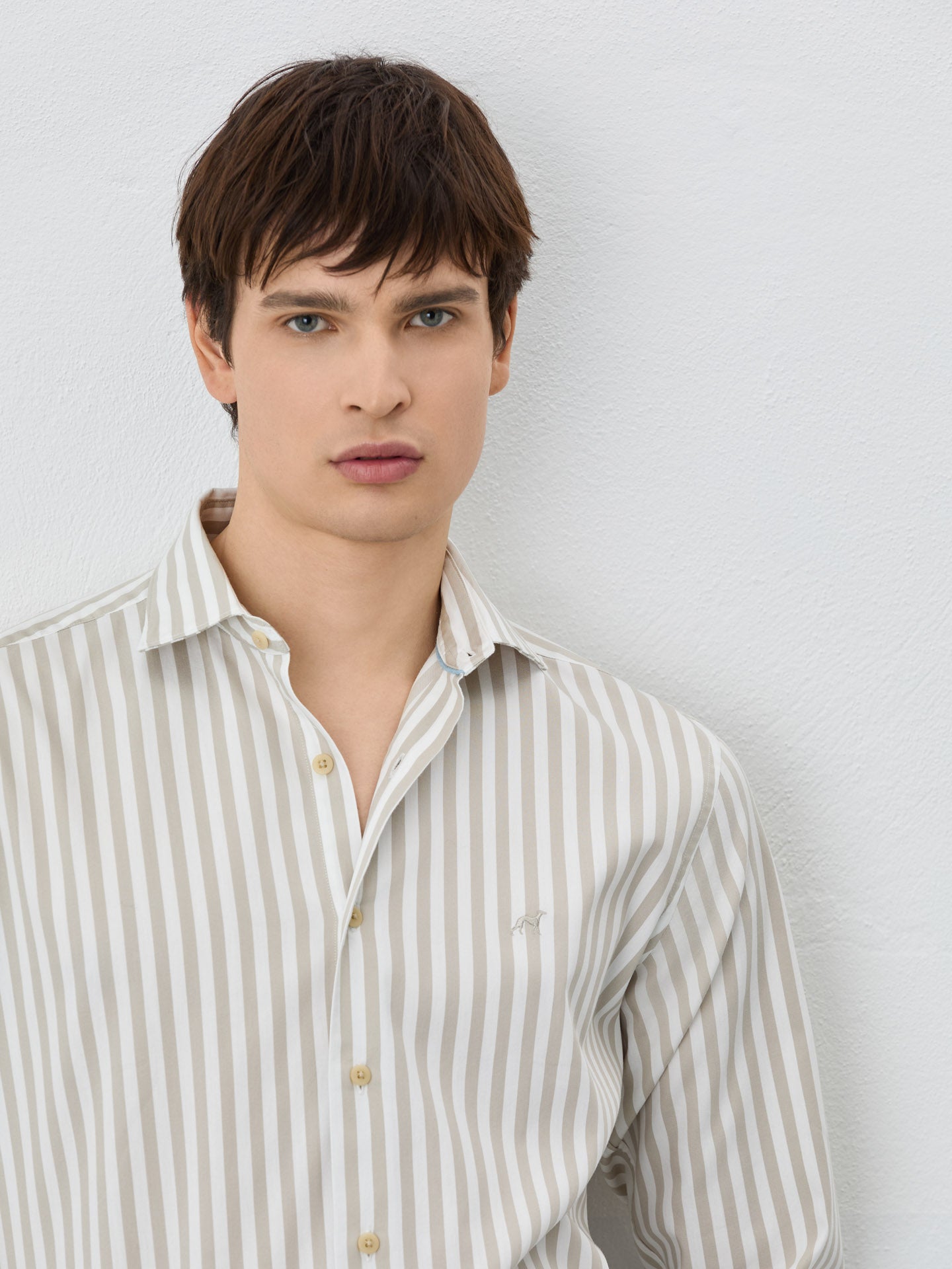 Slim Fit Shirt With Open Collar In BCI Cotton With Stripes